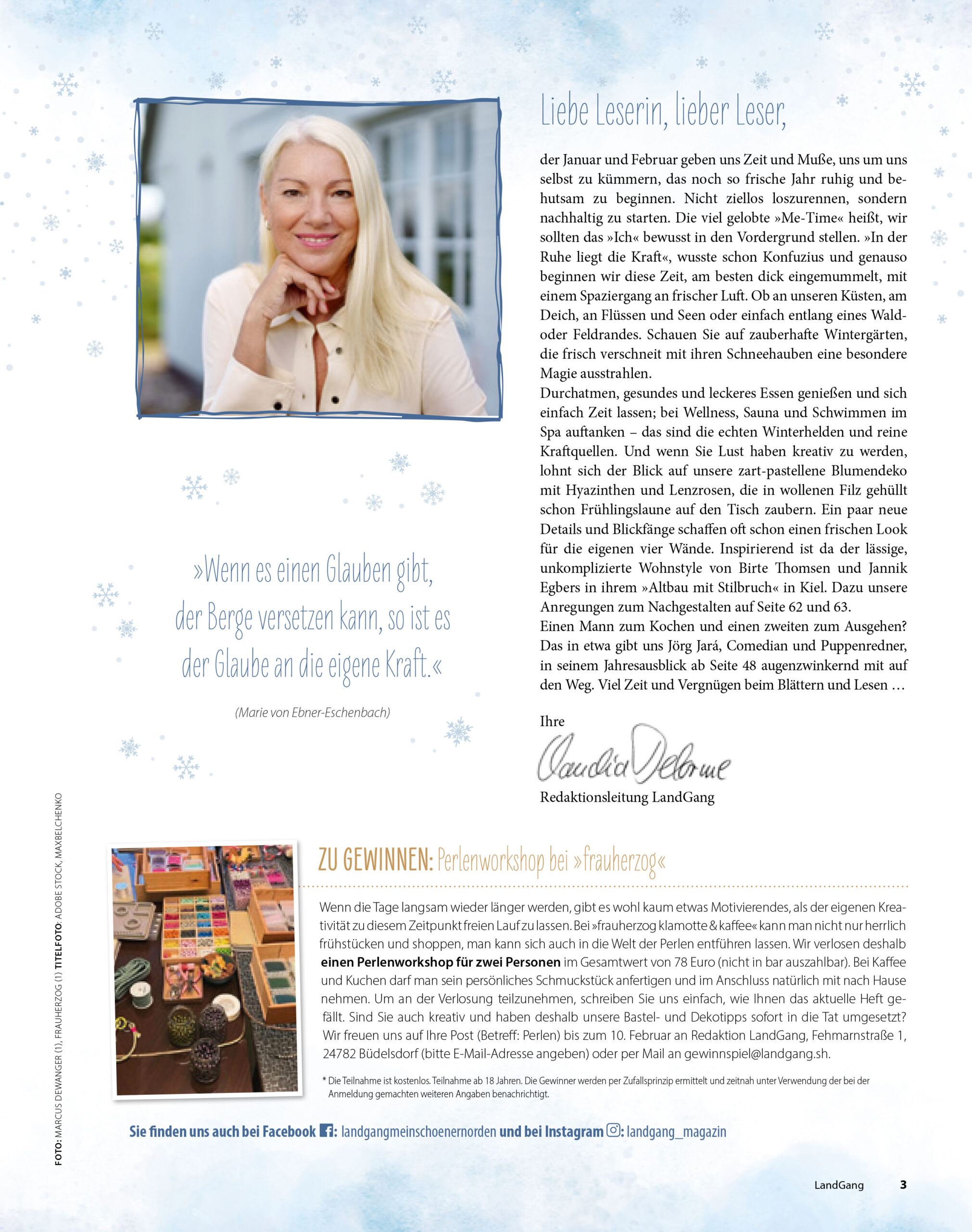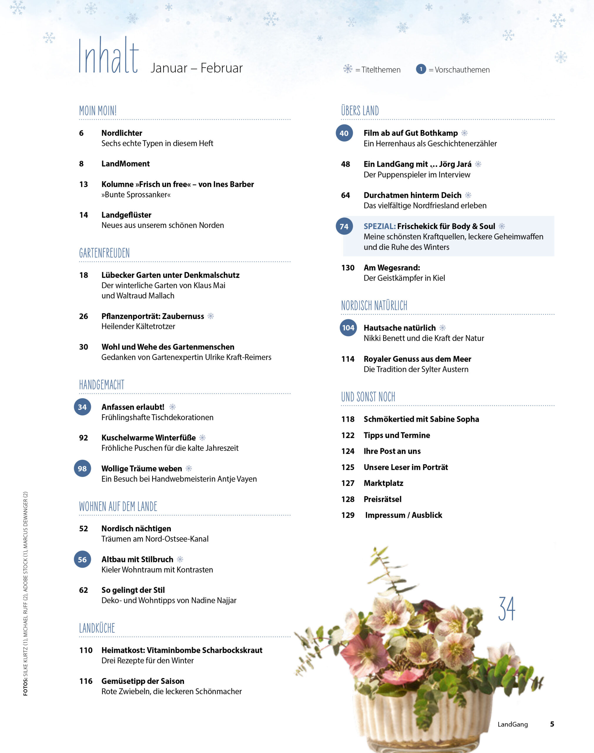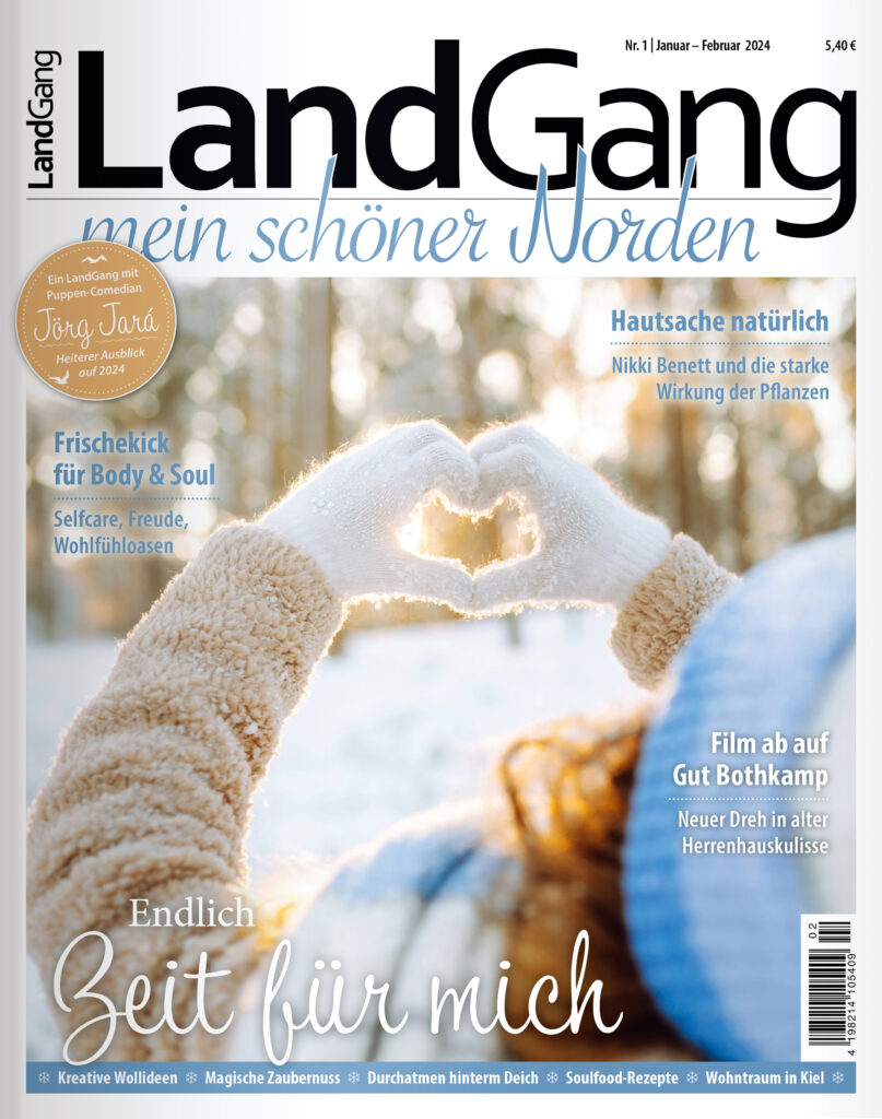 der Januar und Februar geben uns Zeit und Muße, uns um uns selbst zu kümmern, das noch so frische Jahr ruhig und behutsam zu beginnen. Nicht ziellos loszurennen, sondern nachhaltig zu starten. Die viel gelobte »Me-Time« heißt, wir sollten das »Ich« bewusst in den Vordergrund stellen. »In der Ruhe liegt die Kraft«, wusste Konfuzius und genauso beginnen wir diese Zeit, am besten dick eingemummelt, mit einem Spaziergang an frischer Luft. Ob an unseren Küsten, am Deich, oder einfach entlang eines Waldrandes. Schauen Sie auf Wintergärten, die frisch verschneit mit ihren Schneehauben Magie ausstrahlen. Durchatmen, gesundes und leckeres Essen genießen und sich Zeit lassen; bei Wellness, Sauna und Schwimmen auftanken – das sind die echten Winterhelden und reine Kraftquellen. Und wenn Sie Lust haben kreativ zu werden, lohnt sich der Blick auf unsere zart-pastellene Blumendeko mit Hyazinthen und Lenzrosen, die in wollenen Filz gehüllt schon Frühlingslaune auf den Tisch zaubern. Ein paar neue Details und Blickfänge schaffen oft schon einen frischen Look für die eigenen vier Wände. Einen Mann zum Kochen und einen zweiten zum Ausgehen? Das in etwa gibt uns Jörg Jará, Comedian und Puppenredner, in seinem Jahresausblick augenzwinkernd mit auf den Weg.