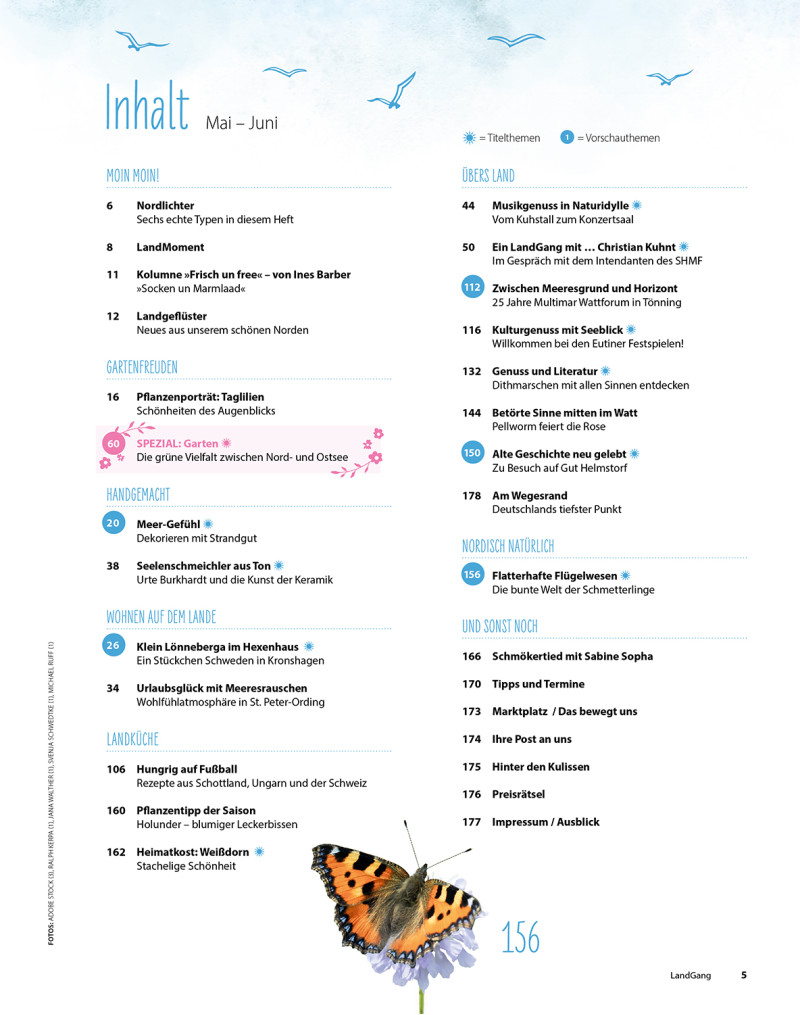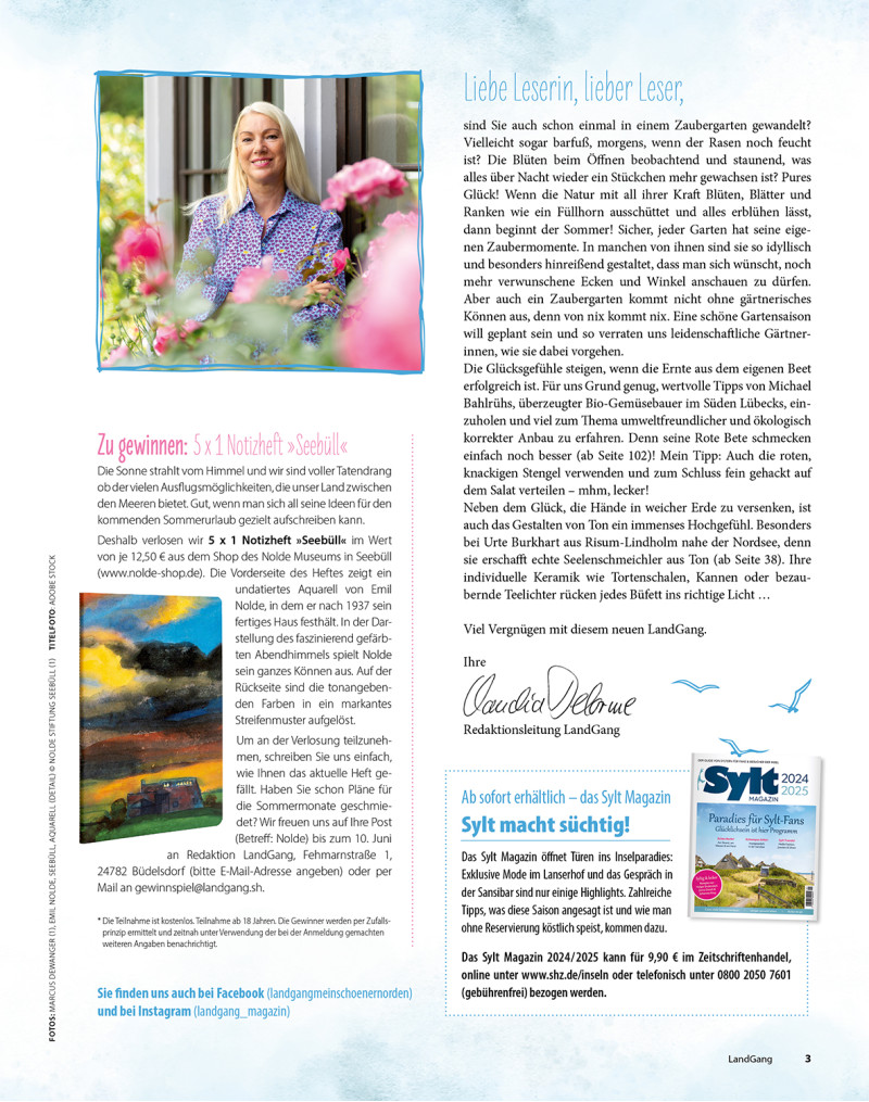 sind Sie auch schon einmal in einem Zaubergarten gewandelt? Vielleicht sogar barfuß, morgens, wenn der Rasen noch feucht ist? Die Blüten beim Öffnen beobachtend und staunend, was alles über Nacht wieder ein Stückchen mehr gewachsen ist? Pures Glück! Wenn die Natur mit all ihrer Kraft Blüten, Blätter und Ranken wie ein Füllhorn ausschüttet und alles erblühen lässt, dann beginnt der Sommer! Sicher, jeder Garten hat seine eigenen Zaubermomente. In manchen von ihnen sind sie so idyllisch und hinreißend gestaltet, dass man sich wünscht, noch mehr verwunschene Ecken und Winkel anschauen zu dürfen. Aber auch ein Zaubergarten kommt nicht ohne gärtnerisches Können aus. Eine schöne Gartensaison will geplant sein und so verraten uns leidenschaftliche Gärtnerinnen, wie sie dabei vorgehen. Die Glücksgefühle steigen, wenn die Ernte aus dem eigenen Beet erfolgreich ist. Für uns Grund genug, wertvolle Tipps von Bio-Gemüsebauer Michael Bahlrühs einzuholen. Denn seine Rote Bete schmecken einfach noch besser! Neben dem Glück, die Hände in weicher Erde zu versenken, ist auch das Gestalten von Ton ein immenses Hochgefühl. Besonders bei Urte Burkhart aus Risum-Lindholm nahe der Nordsee, denn sie erschafft echte Seelenschmeichler aus Ton (ab Seite 38). Ihre individuelle Keramik wie Tortenschalen, Kannen oder bezaubernde Teelichter rücken jedes Büfett ins richtige Licht …
