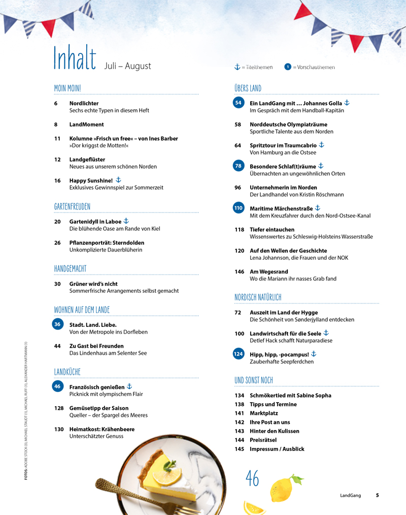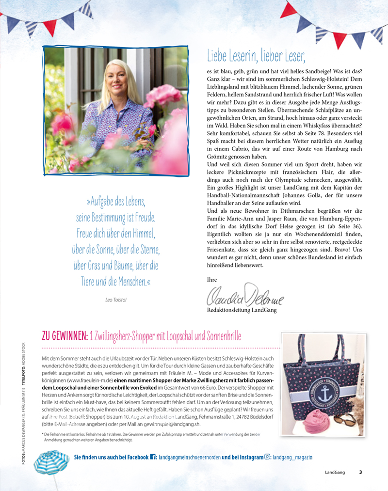 es ist blau, gelb, grün und hat viel helles Sandbeige! Was ist das? Ganz klar – wir sind im sommerlichen Schleswig-Holstein! Dem Lieblingsland mit blitzblauem Himmel, lachender Sonne, grünen Feldern, hellem Sandstrand und herrlich frischer Luft! Was wollen wir mehr? Dazu gibt es in dieser Ausgabe jede Menge Ausflugstipps zu besonderen Stellen. Überraschende Schlafplätze an ungewöhnlichen Orten, am Strand, hoch hinaus oder ganz versteckt im Wald. Haben Sie schon mal in einem Whiskyfass übernachtet? Sehr komfortabel, schauen Sie selbst ab Seite 78. Besonders viel Spaß macht bei diesem herrlichen Wetter natürlich ein Ausflug in einem Cabrio, das wir auf einer Route von Hamburg nach Grömitz genossen haben. Und weil sich diesen Sommer viel um Sport dreht, haben wir leckere Picknickrezepte mit französischem Flair, die allerdings auch noch nach der Olympiade schmecken, ausgewählt. Ein großes Highlight ist unser LandGang mit dem Kapitän der Handball-Nationalmannschaft Johannes Golla, der für unsere Handballer an der Seine auflaufen wird. Und als neue Bewohner in Dithmarschen begrüßen wir die Familie Marie-Ann und Jasper Raun, die von Hamburg-Eppendorf in das idyllische Dorf Helse gezogen ist (ab Seite 36). Eigentlich wollten sie ja nur ein Wochenenddomizil finden, verliebten sich aber so sehr in ihre selbst renovierte, reetgedeckte Friesenkate, dass sie gleich ganz hingezogen sind. Bravo! Uns wundert es gar nicht, denn unser schönes Bundesland ist einfach hinreißend liebenswert.
