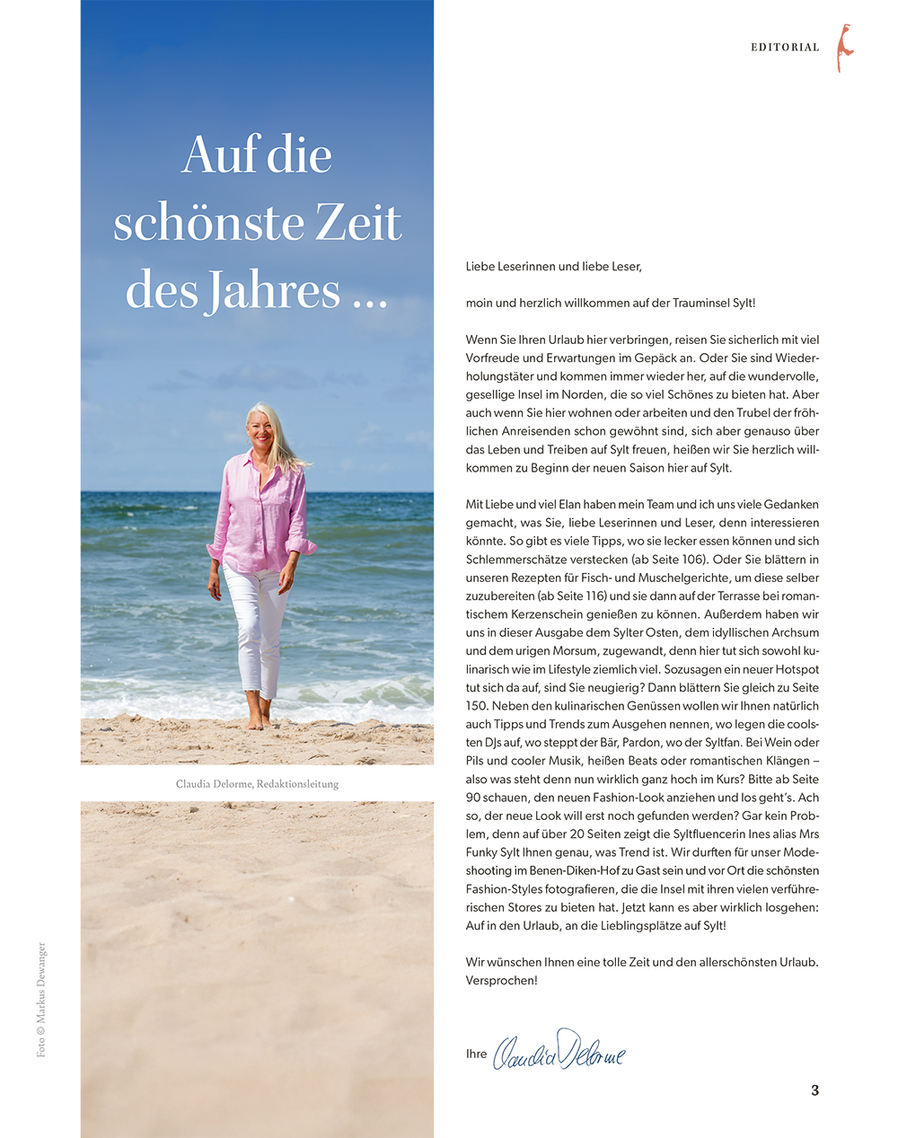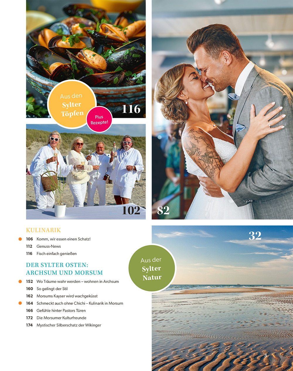 Mit Liebe und viel Elan haben wir uns Gedanken gemacht, was Sie denn interessieren könnte. So gibt es viele Tipps, wo Sie lecker essen können und sich Schlemmerschätze verstecken (ab Seite 106). Oder Sie blättern in unseren Rezepten für Fisch- und Muschelgerichte, um diese selber zuzubereiten (ab Seite 116) und sie dann auf der Terrasse bei romantischem Kerzenschein genießen zu können. Außerdem haben wir uns dem Sylter Osten, dem idyllischen Archsum und dem urigen Morsum, zugewandt, denn hier tut sich sowohl kulinarisch wie im Lifestyle ziemlich viel. Neben den kulinarischen Genüssen wollen wir Ihnen natürlich auch Tipps und Trends zum Ausgehen nennen – also was steht denn nun wirklich ganz hoch im Kurs? Bitte ab Seite 90 schauen, den neuen Fashion-Look anziehen und los geht’s. Ach so, der neue Look will erst noch gefunden werden? Gar kein Problem, denn auf über 20 Seiten zeigt die Syltfluencerin Ines alias Mrs Funky Sylt Ihnen genau, was Trend ist. Jetzt kann es aber wirklich losgehen: Auf in den Urlaub, an die Lieblingsplätze auf Sylt!